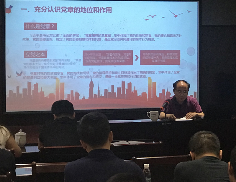 黨總支書記、總裁劉健同志在《學(xué)習(xí)尊崇黨章,爭做合格黨員》的黨課中,從黨章的地位、作用、歷程等方面向黨員全面解讀了中國共產(chǎn)黨章程,從黨章規(guī)定的黨員義務(wù)、習(xí)總書記系列重要論述及“四講四有”等角度闡述了合格黨員的標(biāo)準。他希望公司黨員自覺以黨章、習(xí)總書記講話精神和“四講四有”為標(biāo)尺,隨時糾正個人的思想和行為,保持思想品德的純潔,保持工作作風(fēng)的優(yōu)良,保持工作績效的先進,保持個人行為的廉潔,主動融入公司的發(fā)展大計,盡職盡責(zé)做好本職工作。